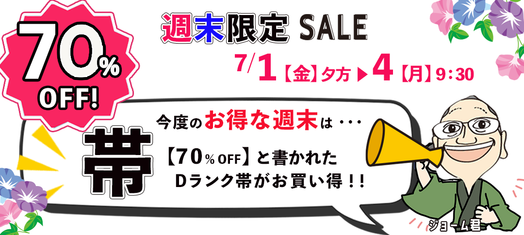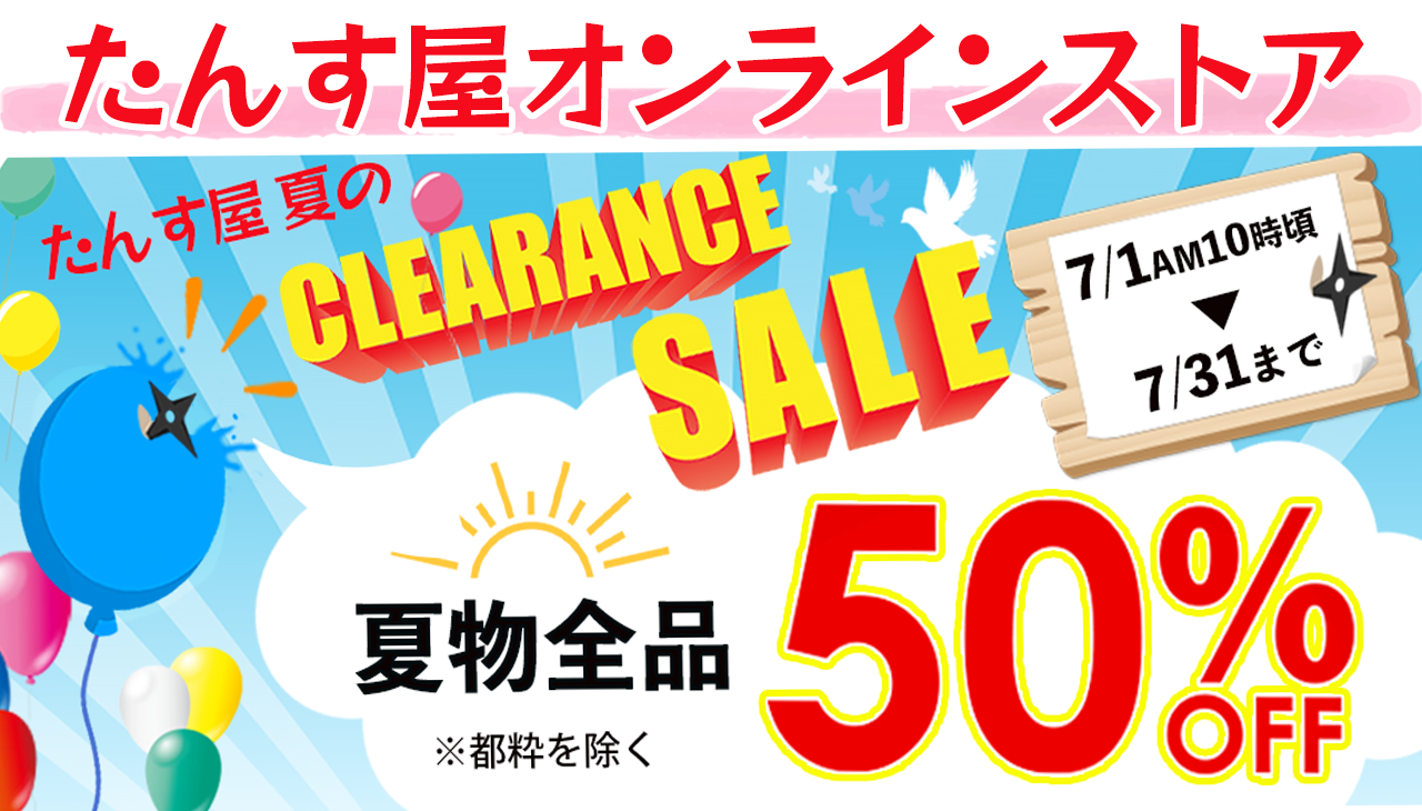 リユース着物「たんす屋」のオンラインショッピングサイト「たんす屋オンオンラインストア」で、7月のマンスリーキャンペーンとして「サマークリアランスセール」を開催します。夏向きの、浴衣・着物・帯・羽織物・男物などを50%OFFで販売。もともとリーズナブルな価格帯のリユース着物を、よりお求めやすい価格で提供いたします。