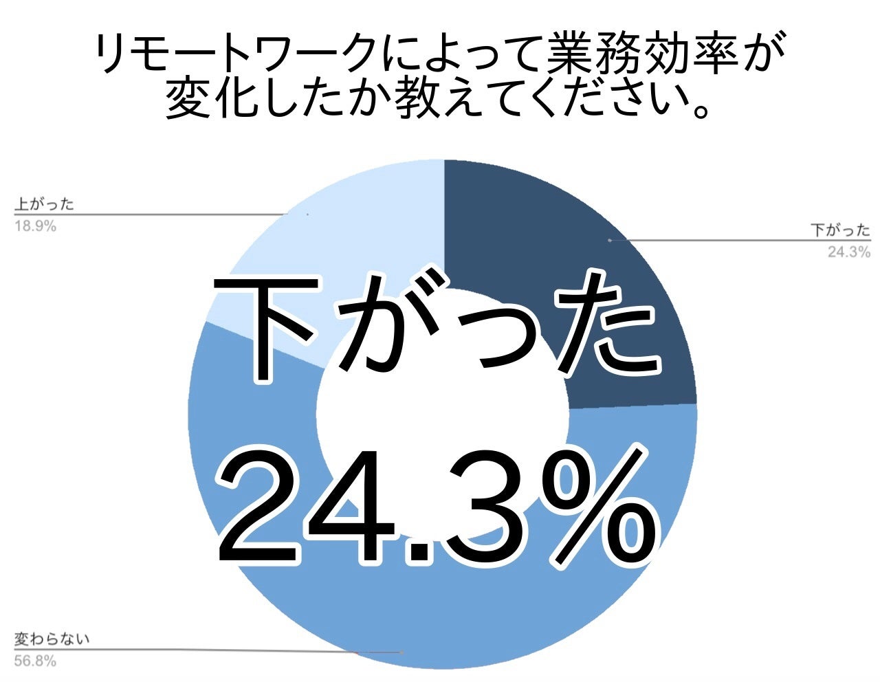 このグラフで注目したいのは、リモートワークによって業務効率が下がったという方がほぼ4分の1を占め(24.3%)、リモートワークにより効率が上がったと考える方(18.9%)より多かったという点です。