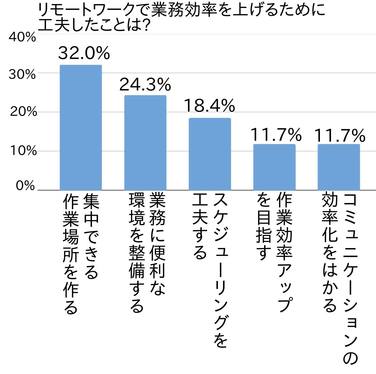 最も多かった「集中できる作業場所を作る(32.0%)」2番目に多かった「業務に便利な環境を整備する(24.3%)」ともに、仕事場として業務に集中しやすく、業務しやすい機器・デスク等の整った環境づくりをしたという方が多数見受けられました。