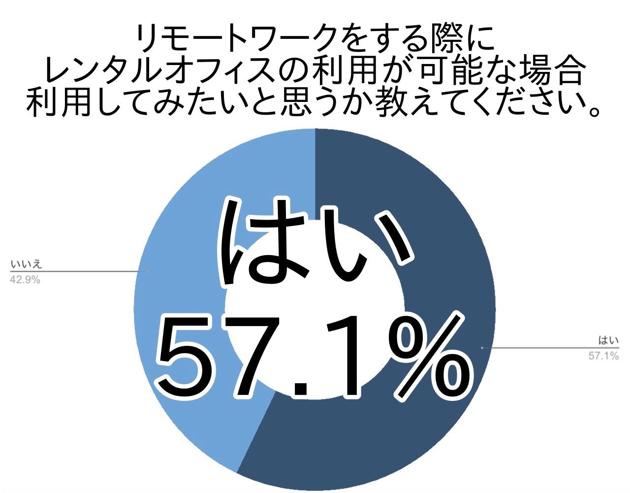 アンケートでは6割弱(57.1%)の方が、リモートワークの際にレンタルオフィスが利用可能な場合に利用してみたいと答えました。