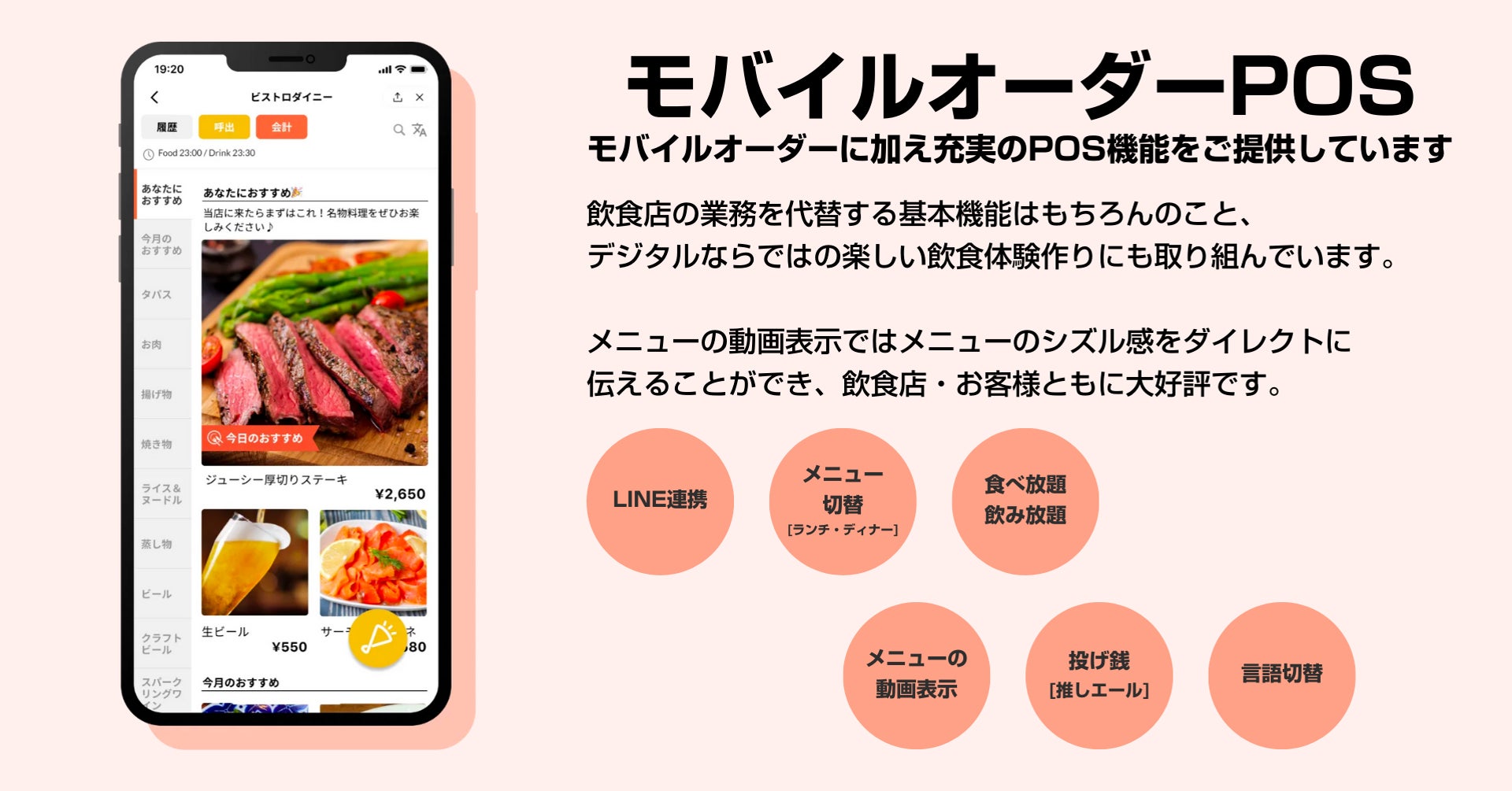海外観光客のお客様に対して、メニューの英語切替機能を用意。海外のお客様の注文のストレスの削減と共に、英語の話せないスタッフの、海外のお客様対応の心理的ハードルを削減します。