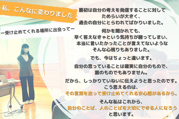 3ヶ月に1度、学生の挑戦の経過を発表するイベントを開催しています。学生は、3ヶ月間の挑戦の進捗はもちろん、自分の想いや葛藤を、自由な形式で表現しています。