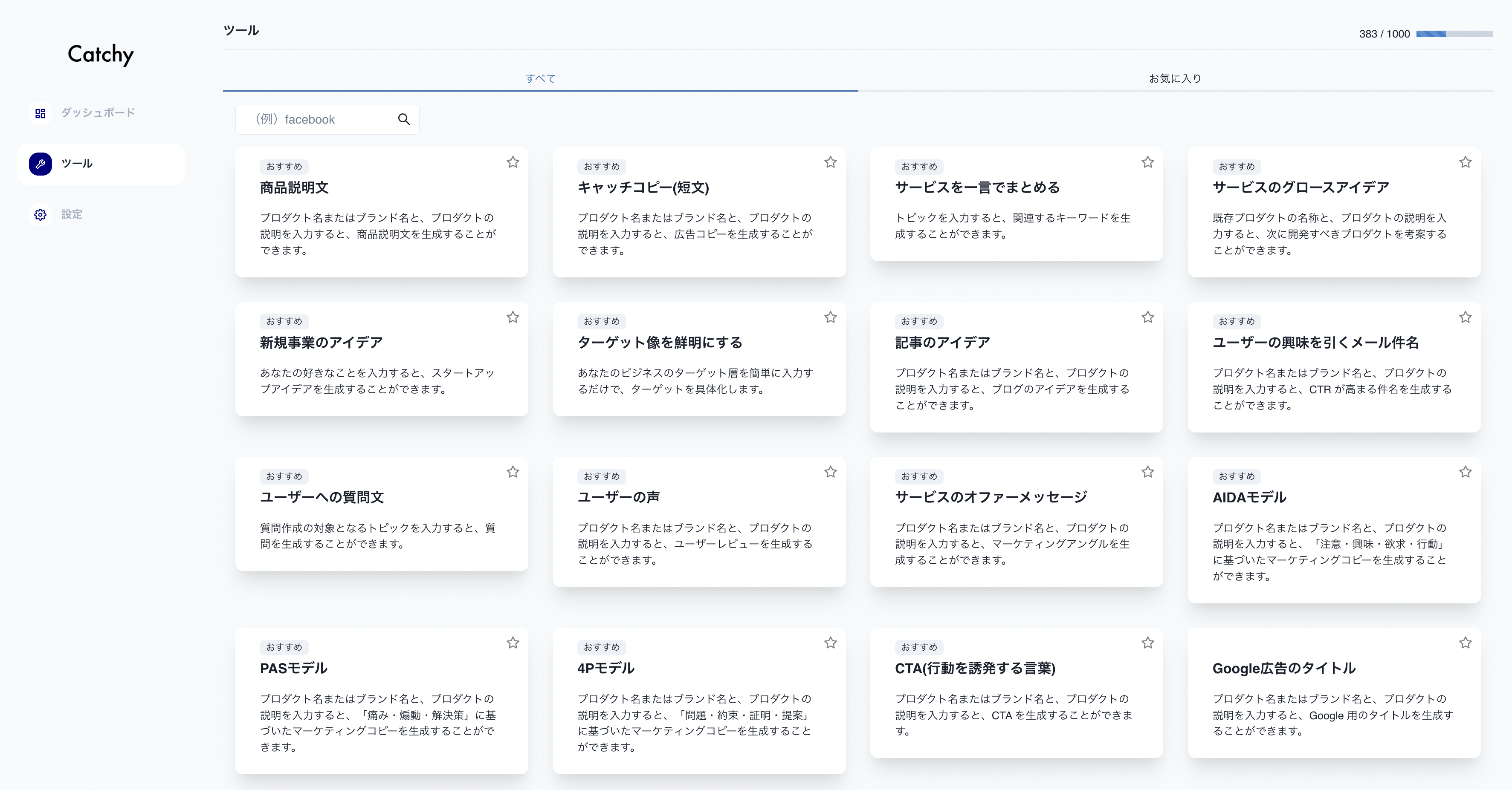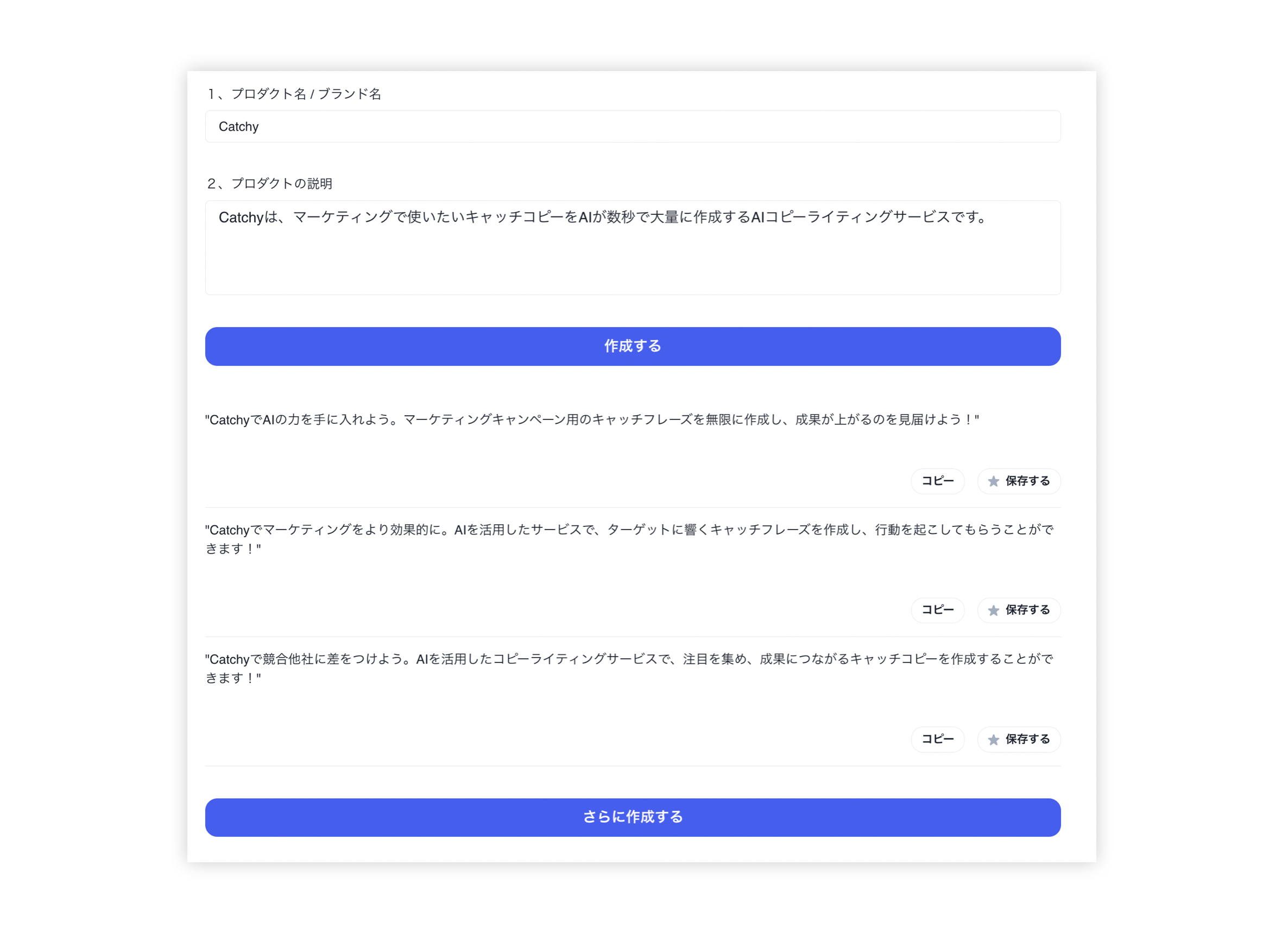 - 説明文: Catchyは、マーケティングで使いたいキャッチコピーをAIが数秒で大量に作成するAIコピーライティングサービスです。