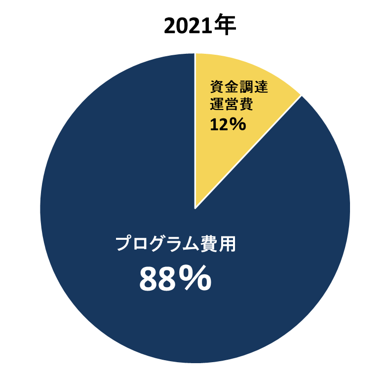 ルーム・トゥ・リードでは支援者からの寄付の88%を直接現地の支援活動に投資しています(2021年アニュアルレポートより)。この度チャリティナビゲーターによって特に評価されたポイントでもある卓越した運営効率により、団体の運営にはわずか12%の費用のみが充てられています。その結果、支援者からの寄付金が、確実かつ迅速に子ども達の識字率向上と女子教育に活かされています。