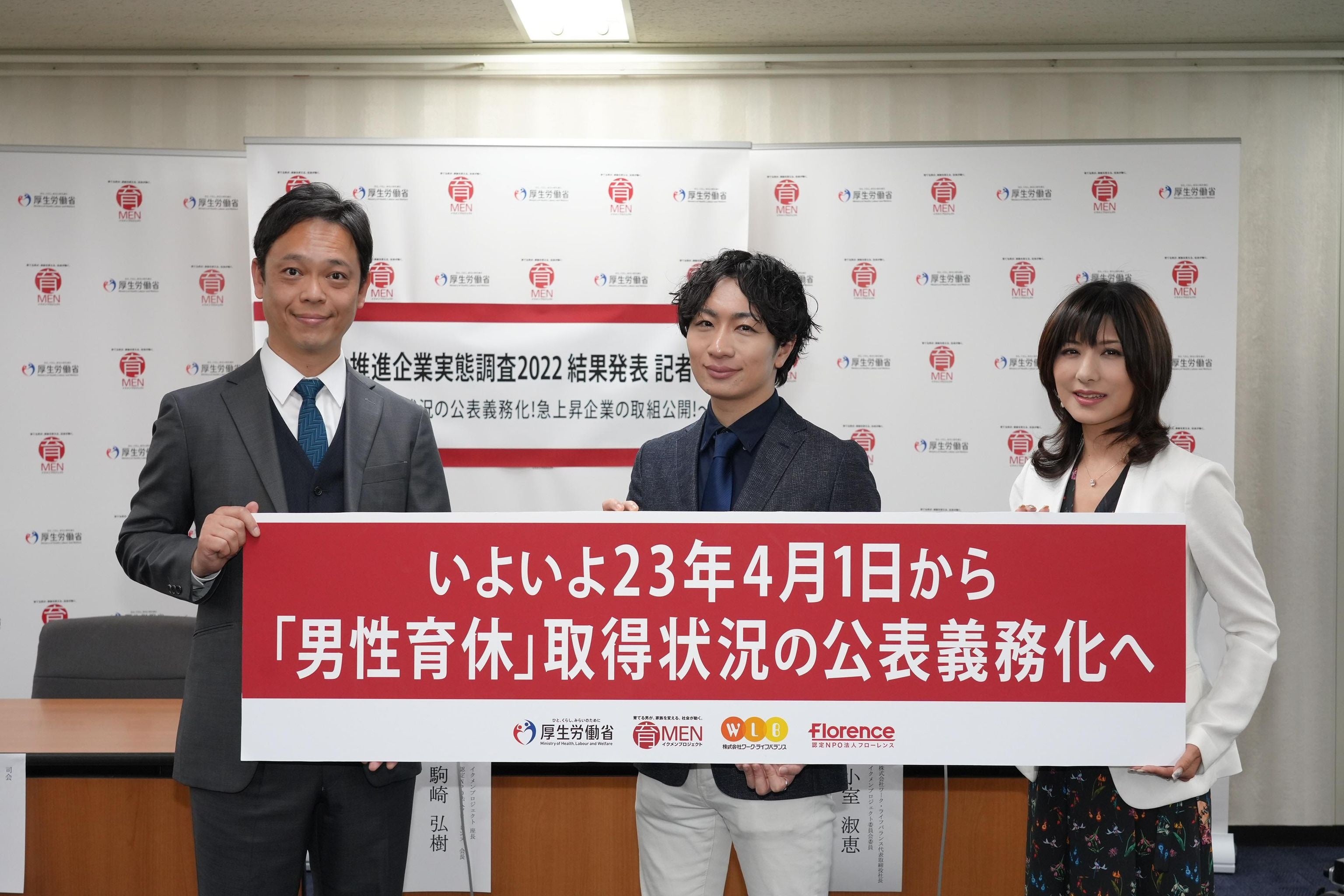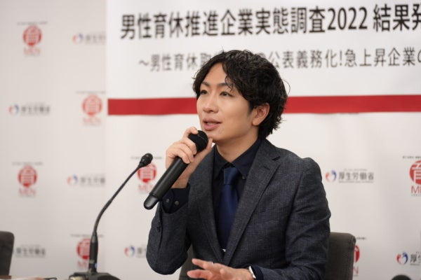 日本全国の男性育休平均取得率は2021年度で13.97%(厚生労働省調べ)に対して、今回の調査の結果、「男性育休推進企業」では、平均取得率76.9%、平均取得日数40.7日という結果が出ました。また、男性育休取得推進に向け、企業がどのような施策に取り組んだかについても調査しました。記者会見では4月の公表義務化を見据え、男性育休取得の現状と、取得促進につながった施策について発表。また、取得率の伸び率が高いなど、さまざまな視点から注目すべき企業名とその取り組みについてもご紹介しました。さらに今後企業が進めるべき施策について、イクメンプロジェクトの立場からご提案しました。