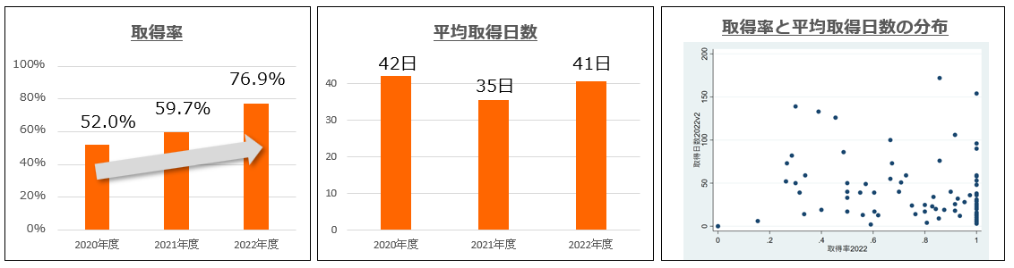 注:取得率、取得日数ともに3年間のデータがある企業・団体のみを集計。有効回答数はそれぞれ92、83。2022年度は回答時点での見込みの数値。