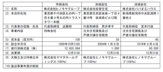 株式会社ヒノキヤグループ(本社:東京都千代田区 代表取締役社長 近藤昭 以下、ヒノキヤグループ)は、子会社である株式会社桧家住宅(以下、桧家住宅)、株式会社パパまるハウス(以下、パパまるハウス)、株式会社ヒノキヤレスコ(以下、ヒノキヤレスコ)、株式会社日本ハウジングソリューション(以下、日本ハウジングソリューション)、まいすまい株式会社(以下、まいすまい)及び株式会社桧家リフォーミング(以下、桧家リフォーミング)を消滅会社として、当社を存続会社とする吸収合併を行うことを決議しましたのでお知らせいたします。