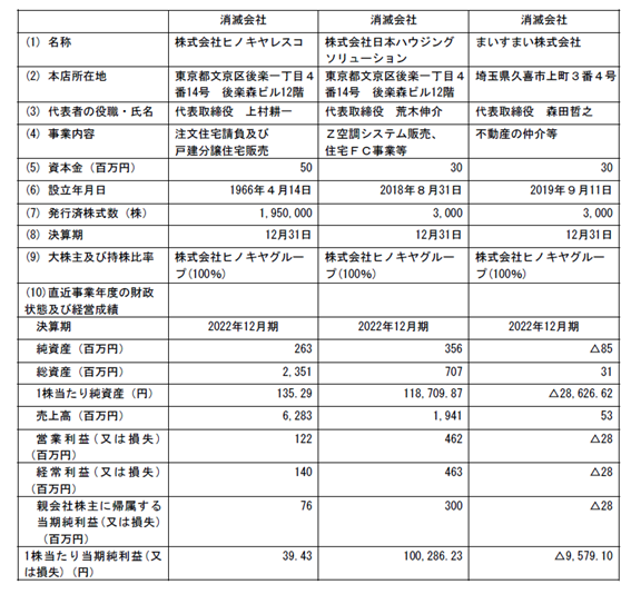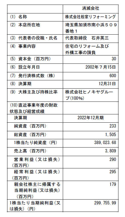 ヒノキヤグループを存続会社、その子会社6社を消滅会社とする吸収合併方式とし、子会社6社は解散いたします。