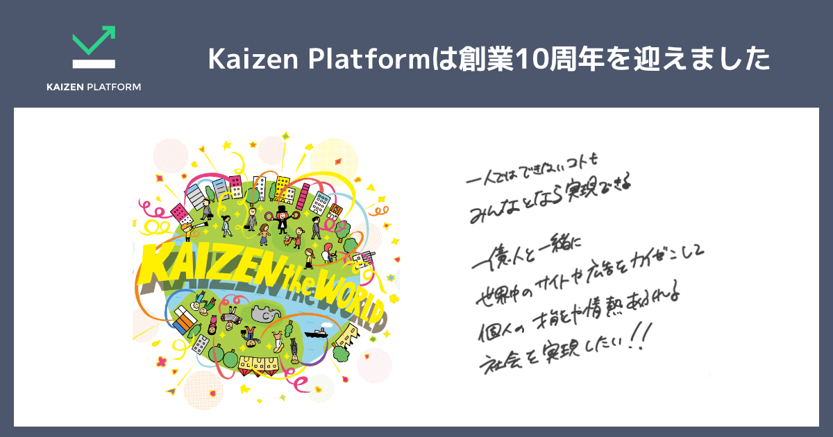 それから10年、多くのお客様、従業員、グロースハッカー、パートナー、株主、そして私たちがカイゼンさせて頂いているサービスをご利用いただく数多くのユーザーのみなさまに支えられ、10周年を迎える事ができました。