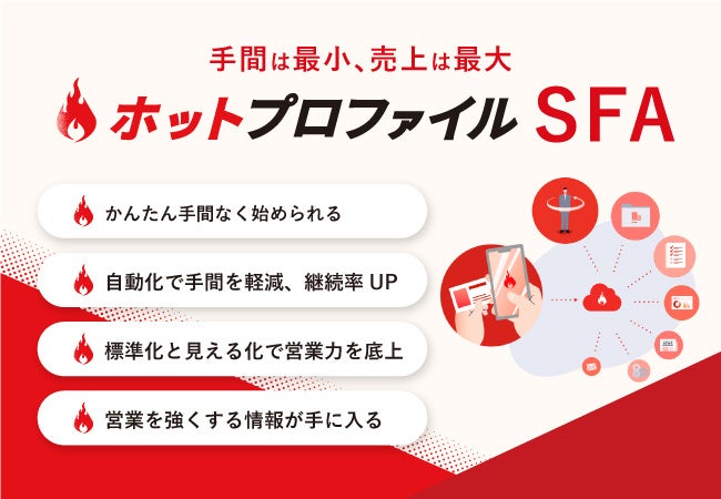 コロナ禍や働き方改革の推進により、企業の売上に直結する営業部門の生産性向上や営業力強化、将来を見通すための売上予測の強化による中長期的な事業成長を目指し、SFAを導入する企業が増えています。一方で、運用を開始するまでにはデータ移行や運用ルールの策定などさまざまな準備を行う必要があり、「導入の準備に時間をかけられない」「導入しても入力の手間や煩雑な操作で利用が続かない」といった課題が散見されます。このような課題を解決し、企業の成長を後押しするために「ホットプロファイル SFA」を強化した新バージョンをリリースいたします。