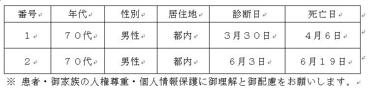 新型コロナウイルスに関連した患者の死亡について business Twitter Facebook はてブ Pocket LINE コピー 2022.06.30 この記事は約1分で読めます。 都内で新型コロナウイルスに感染した方が死亡されましたのでお知らせします。 お亡くなりになった方のご冥福をお祈り申し上げます。