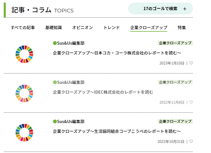 また、弊社が2008年より運営している「CSR図書館.net」(https://csr-toshokan.net/)に掲載された数千冊のCSRレポート等から、SDGsに関する取り組み内容をピックアップして紹介する「企業クローズアップ」も連載しています。