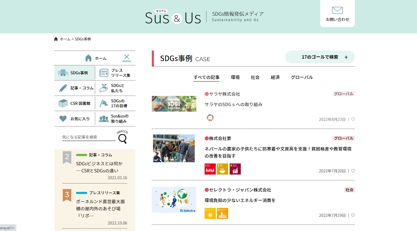 当サイトコンテンツ「SDGs事例」では、企業・NPO等のSDGsに関する取り組みを、読みやすい記事形式で掲載しています(https://susus.net/case/)。