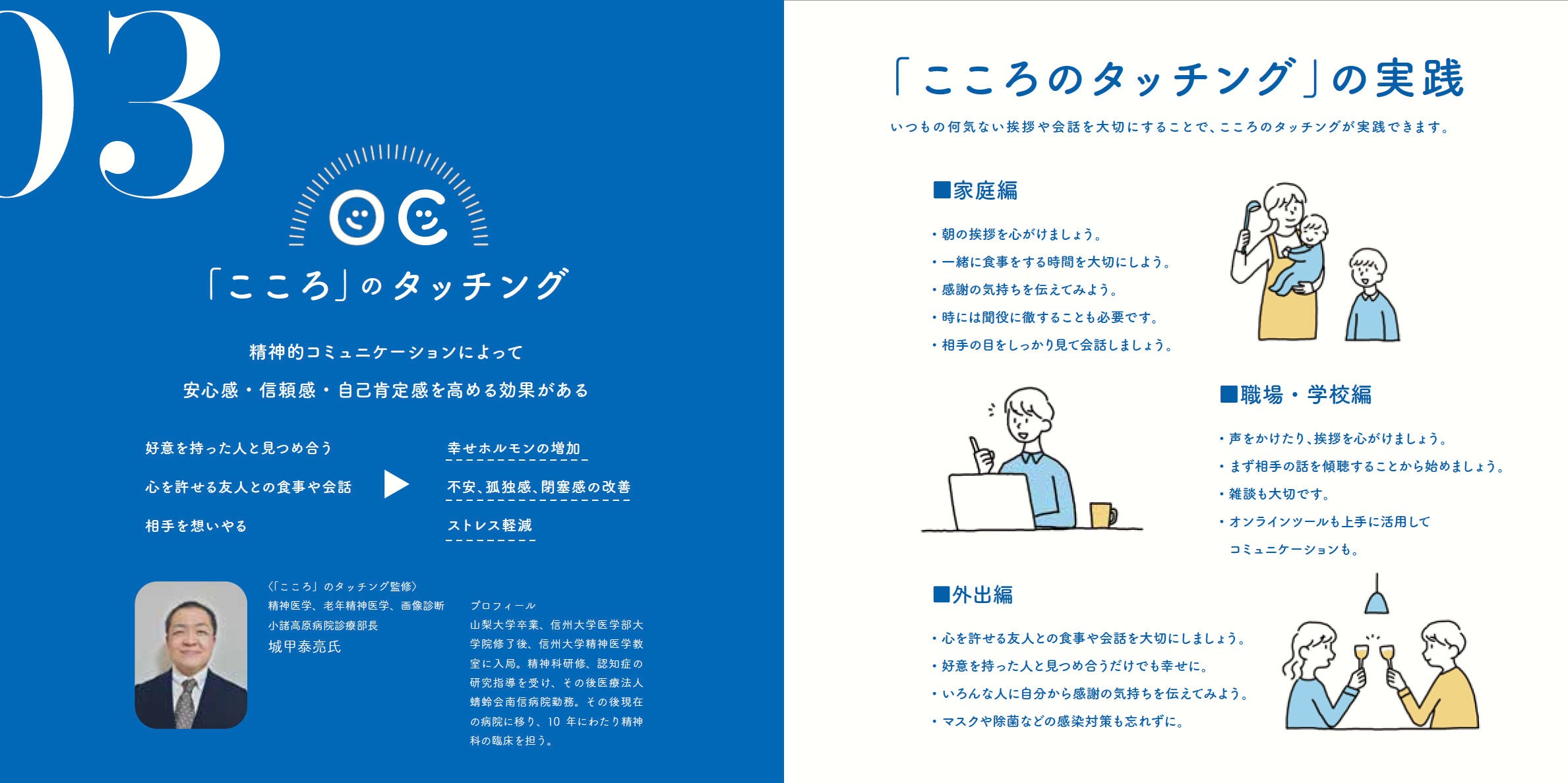触れ合いには、手をつなぐ・さする・抱きしめ合うといった「からだ」の触れ合いと、目と目を合わせる・優しく接する・感謝を伝えるといった「こころ」の触れ合いがあります。本プロジェクトではこの2つの触れ合いの大切さを伝えるとともに、効果的に幸せホルモン「オキシトシン」を分泌させるためのタッチングノウハウを専門家の監修のもと開発し、特設サイトや「エッセンシャルタッチブック」を通して発信しています。