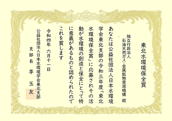 JOGMECは、岩手県八幡平市の「旧松尾鉱山新中和処理施設」(注)におけるこれまでの維持管理が、北上川の清流化に貢献する水環境保全活動として認められ、公益社団法人日本水環境学会東北支部の令和3年度「東北水環境保全賞」を受賞いたしました。