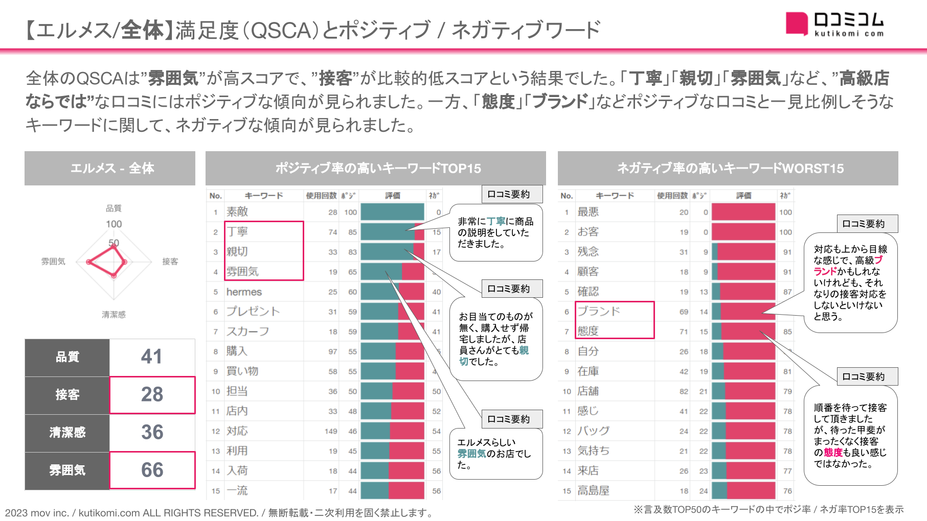 今回は、このAI解析を用いて【エルメス】のQSCA・ポジ / ネガキーワードを確認しました。