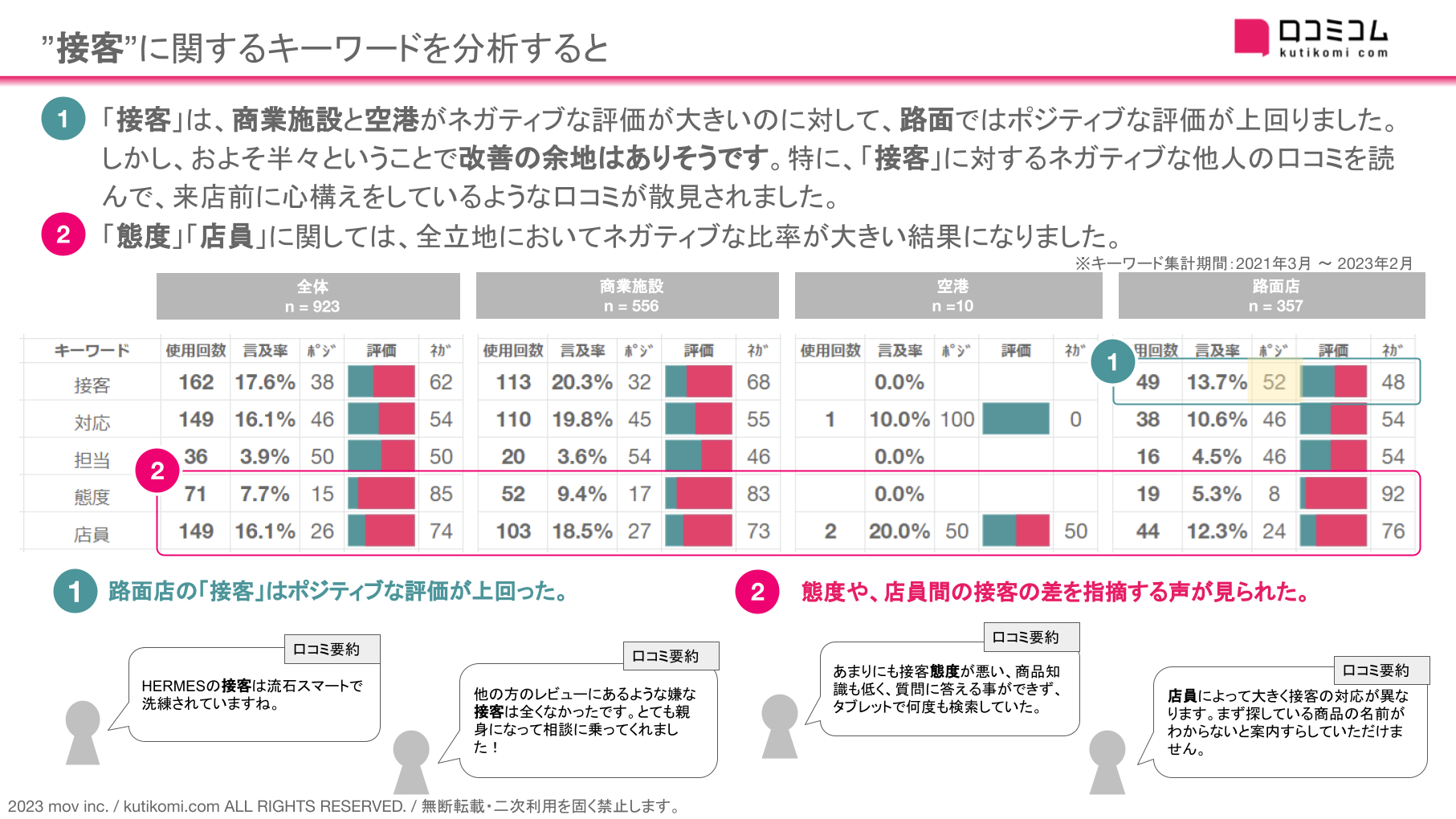 一方「態度」「店員」に関しては、全立地においてネガティブな比率が大きい結果になりました。