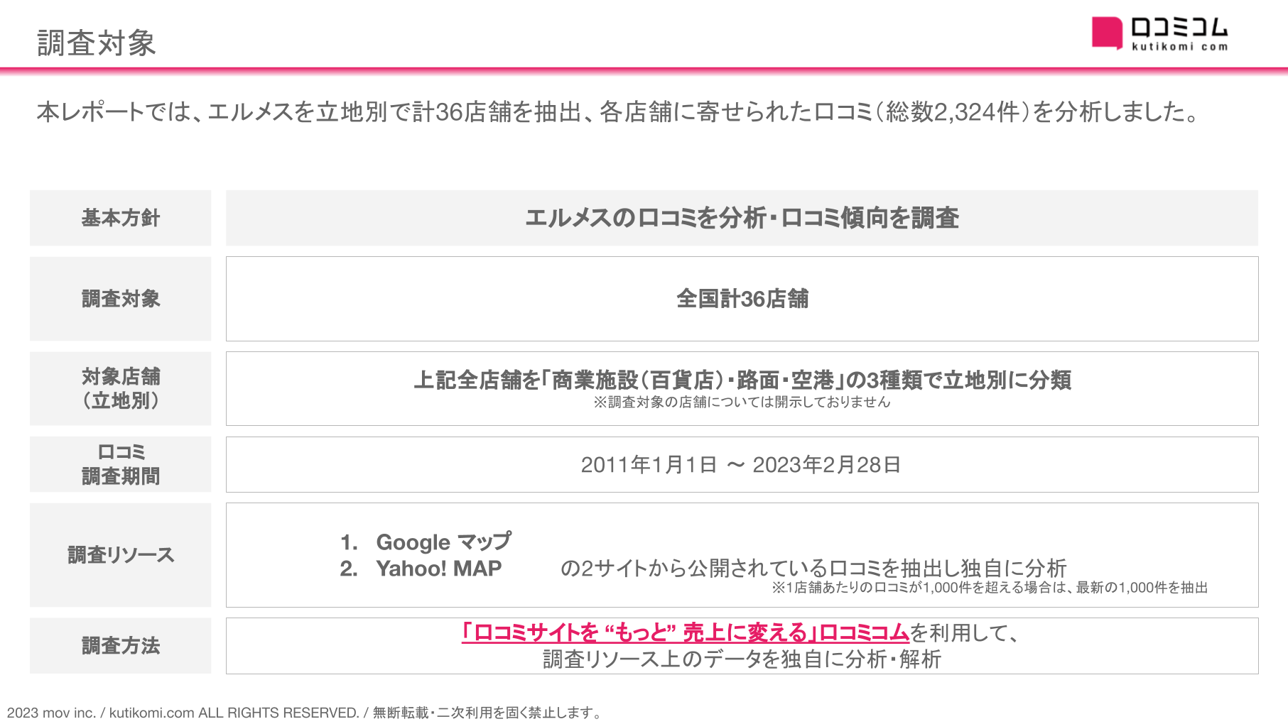 本レポートでは、エルメスを立地別で計36店舗を抽出、各店舗に寄せられた口コミ(総数2,324件)を分析しました。