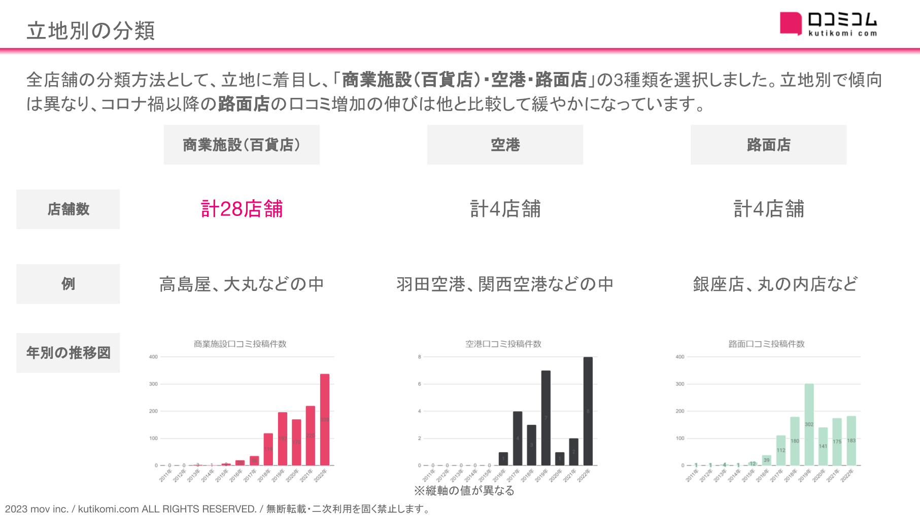 立地別で傾向は異なり、コロナ禍以降の路面店の口コミ増加の伸びは他と比較して緩やかになっています。