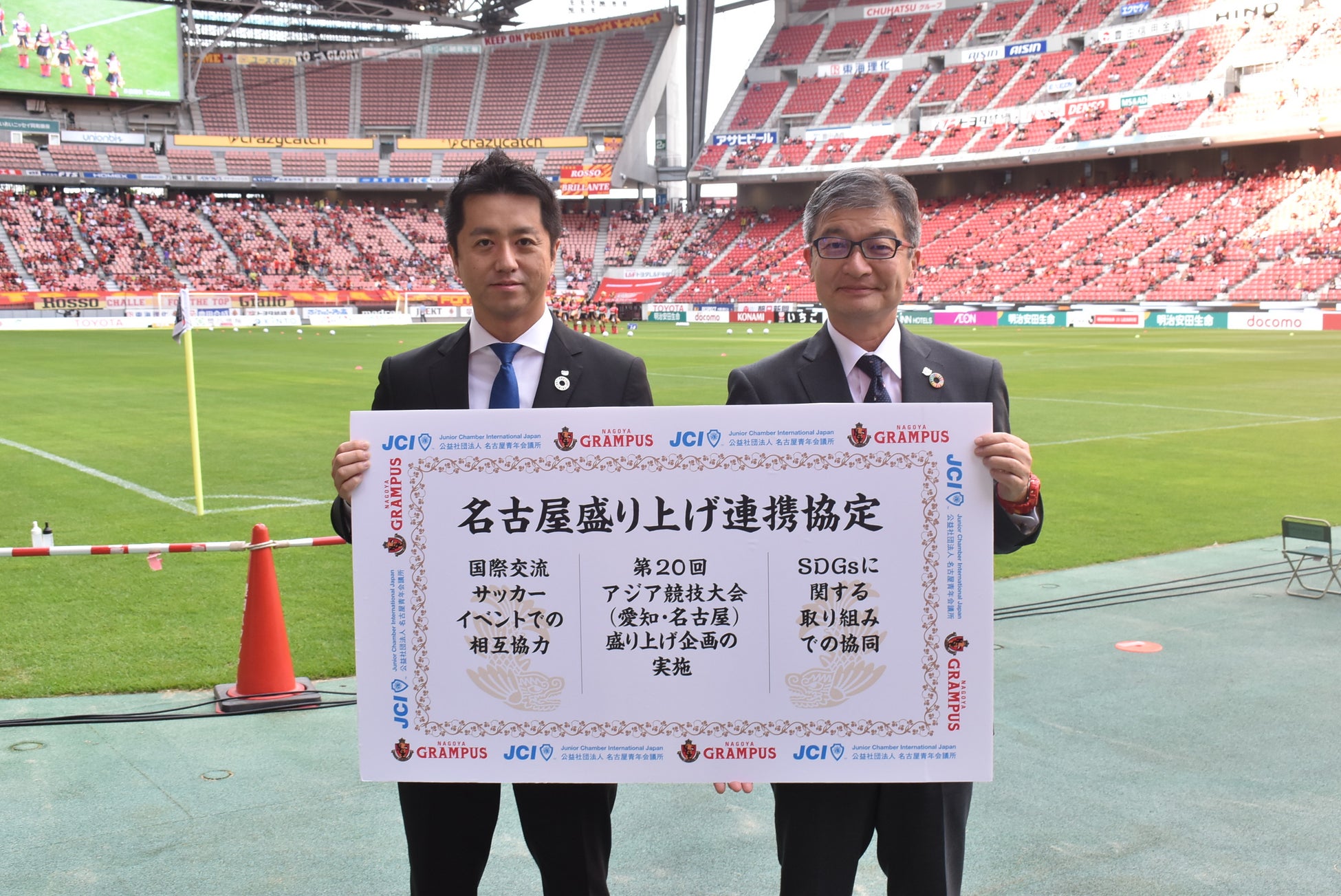 名古屋青年会議所は、名古屋グランパスと名古屋をスポーツの力で盛り上げることを目的として、名古屋盛り上げ連携協定を締結しました。