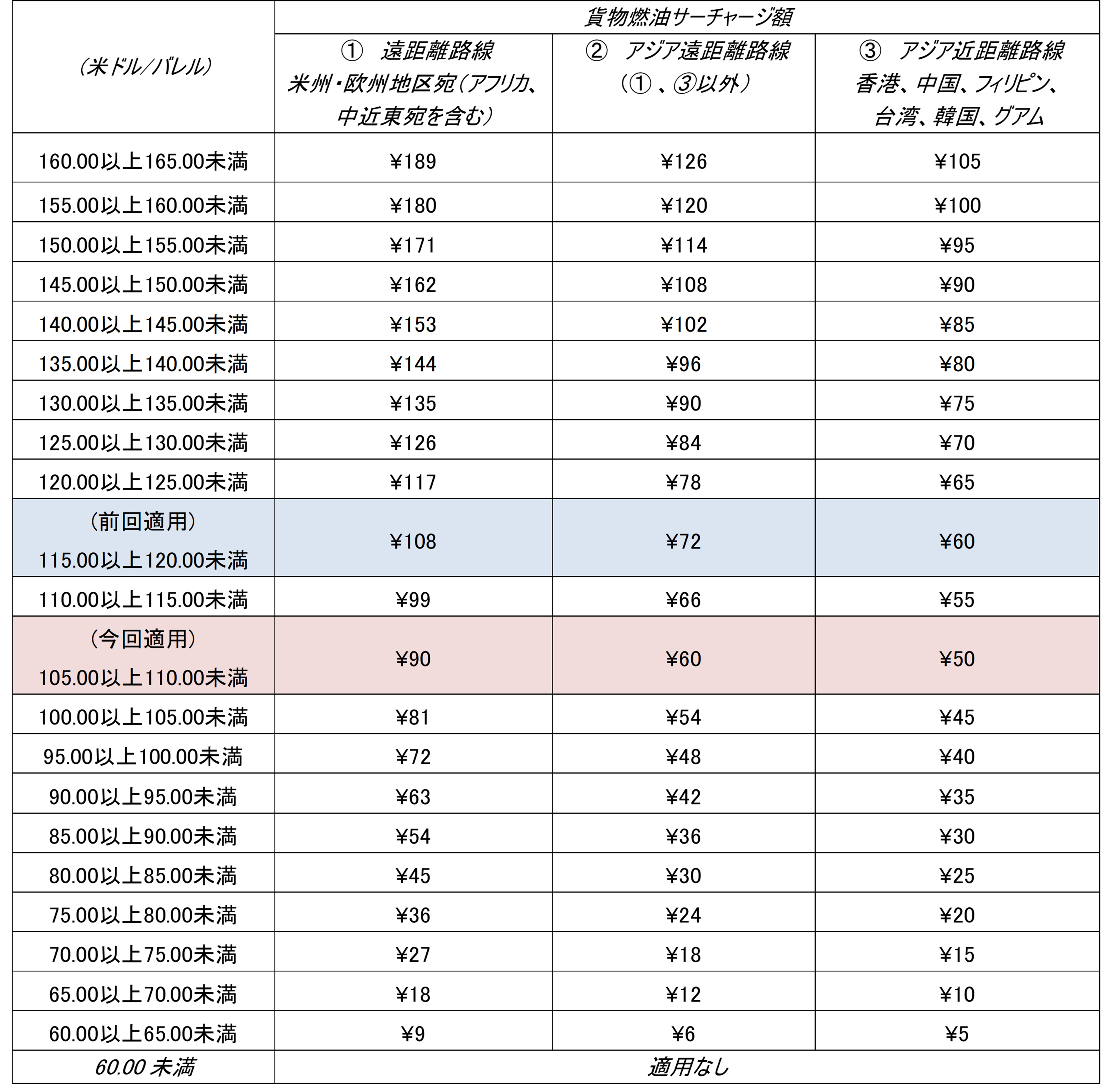 貨物燃油サーチャージテーブル (表示価格は貨物1kgあたり)