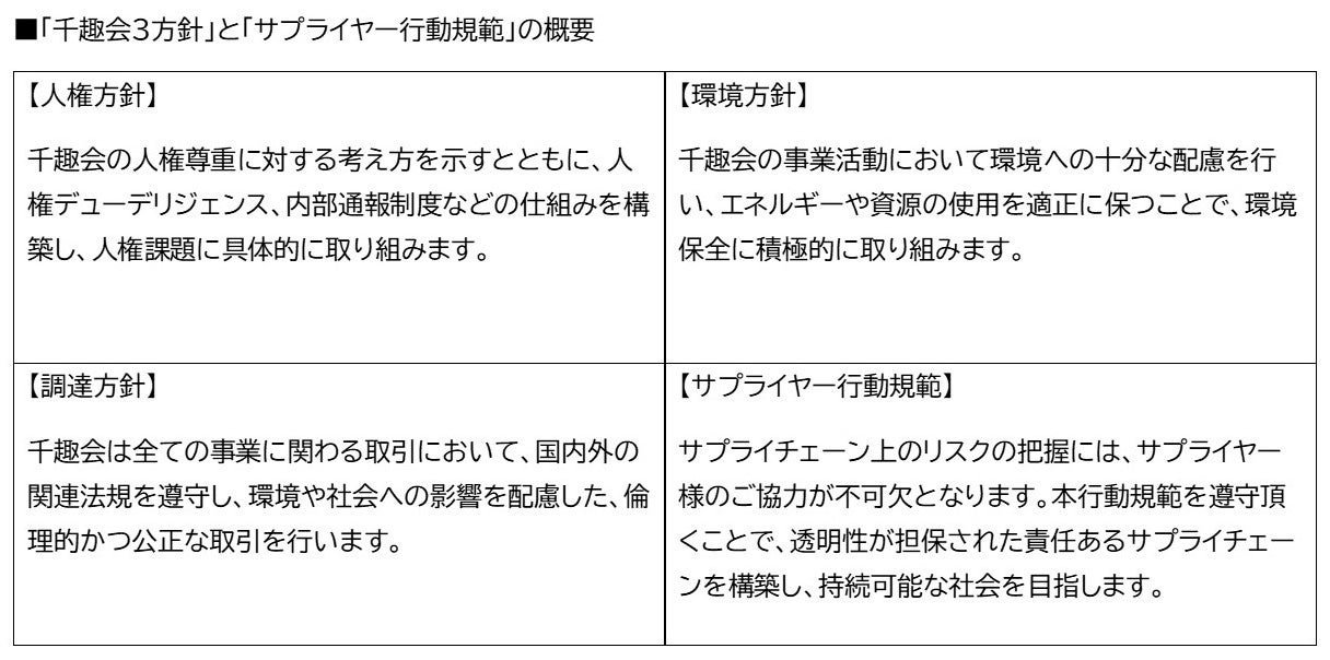 株式会社千趣会(本社:大阪市 代表取締役社長:梶原 健司 以下 千趣会)は、持続可能な社会の実現に向け、「千趣会人権方針・環境方針・調達方針(以下 千趣会3方針)」および、「サプライヤー行動規範」を制定いたしました。