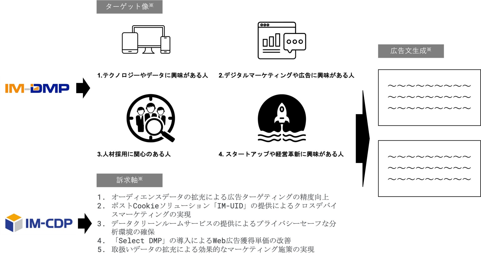 「世の中のさまざまな領域における、データを使った効率化」をミッションに掲げ、国内DMP市場導入シェアNo.1(※1)のデータ活用プラットフォーム「IM-DMP」を保有するデータマーケティングカンパニー。約4.7億のオーディエンスデータ(※2)と高度な分析技術を掛け合わせたデータ活用プラットフォーム「IM-DMP」の提供・構築支援、データ活用に関するコンサルティングサービスを提供しています。また、プライバシー保護に関する取り組みとして、一般社団法人 日本経済団体連合会が掲げる「個人データ適正利用経営宣言」に賛同しています。今後はSales TechやFin Tech、Privacy TechなどのX-Tech領域に事業を展開し「データビジネスのプロデューサー集団」を目指します。