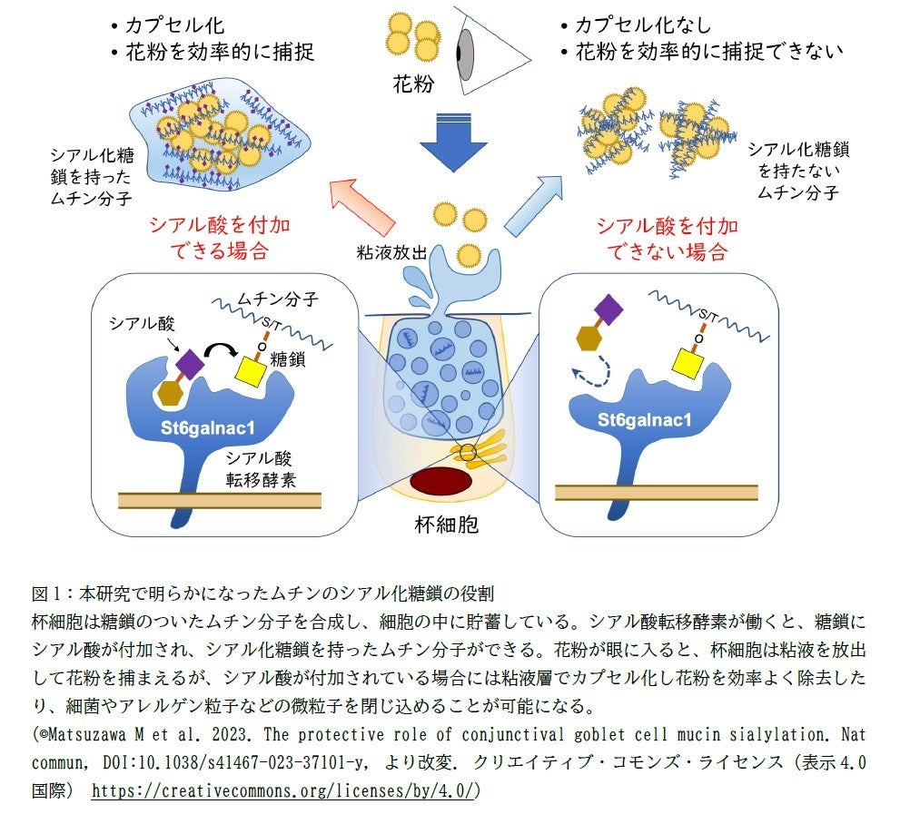 興味深いことに、シアル化されたムチンは眼に入ってきた花粉粒子を効率的に捕まえ、ゲル状の被膜でカプセル化することがわかりました。一方、シアル化されていないムチンではこの作用がほとんどないこともわかりました。これらの結果から、シアル化糖鎖を持つムチンは眼の表面を保護する役割があると考えられます。