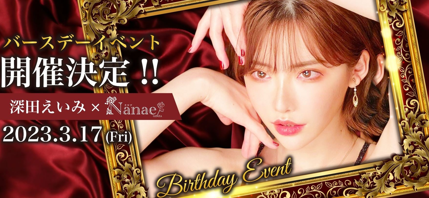 「こんにちは。深田えいみです。今年の誕生日を迎える瞬間に皆さんと楽しく飲むことができる企画を考えました。銀座ななえママの『Nanae』さんでなんと誕生日当日に銀座ホステスに挑戦します!たくさんの方々に遊びに来ていただけると嬉しいです。あなたと誕生日にお会いできますように。」
