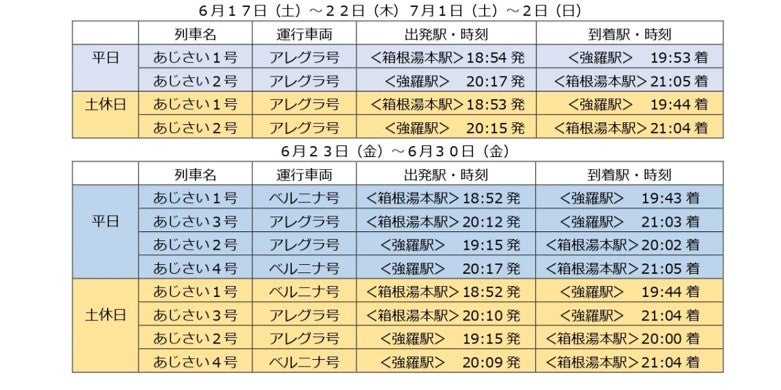 あじさい夜間ライトアップ、「夜のあじさい号」、招待列車の詳細は以下の通りです。