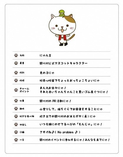 「にゃん吉」は平成21年(2009年)に開催された関川村の名所をまわるウォーキングラリーイベントを盛り上げるために誕生しました。誕生以来14年間、村の様々なイベントやお知らせでも村のPR活動に活躍し、村民に愛されてきました。本人も、公式マスコットキャラクターになることを希望していましたが、趣味の山登りに多くの時間を取られることから勤務時間が村の採用条件に適合しませんでした。しかしながらこの度「にゃん吉を村のキャラクターにしてほしい」という村民の熱い要望と、これまでの村への貢献を勘案し、業務に支障をきたさない範囲であれば趣味の山登りは今まで通り続けても良いという条件で、令和5年4月1日付で関川村公式マスコットキャラクターに採用します。長きにわたり就活を続けてきたにゃん吉、日本一就活に苦労したキャラクターと言えるかもしれません。これからは今まで以上に村のイベントやお知らせに登場し、関川村をPRしていきます。口癖は「さすけね」。これは関川村の方言で「No problem」という意味です。皆様よろしくお願いします。