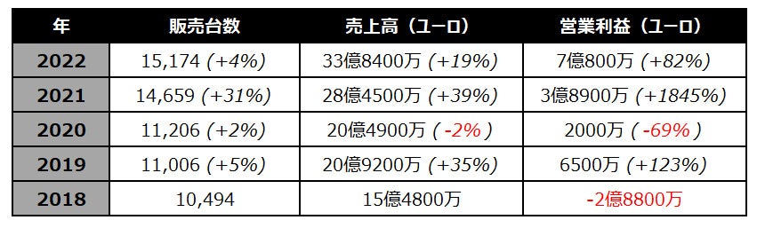 販売台数は2021年比で4%増にとどまりましたが、営業利益は82%増の7億800万ユーロという好業績となりました。