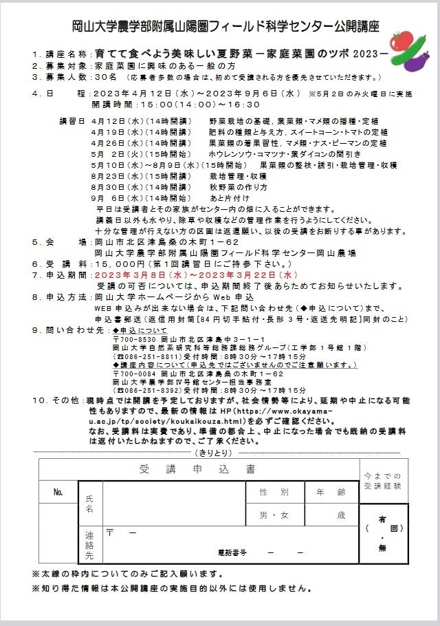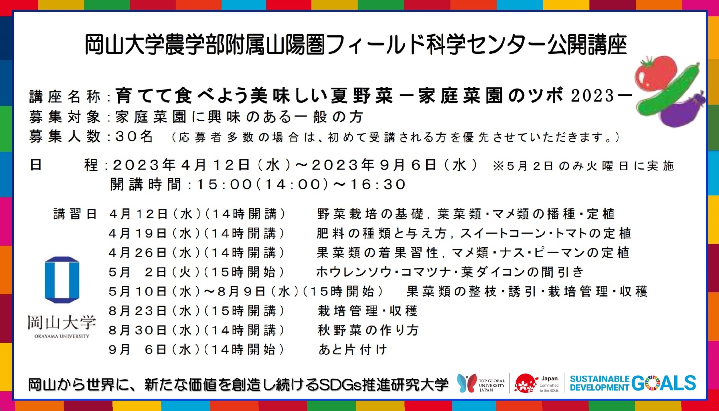 国立大学法人岡山大学(本部:岡山市北区、学長:槇野博史)の農学部農学部附属山陽圏フィールド科学センター岡山農場では、2023年4月12日(水)~2023年9月6日(水)の期間に公開講座「公開講座 育てて食べよう美味しい夏野菜-家庭菜園のツボ2023-」を開催します。
