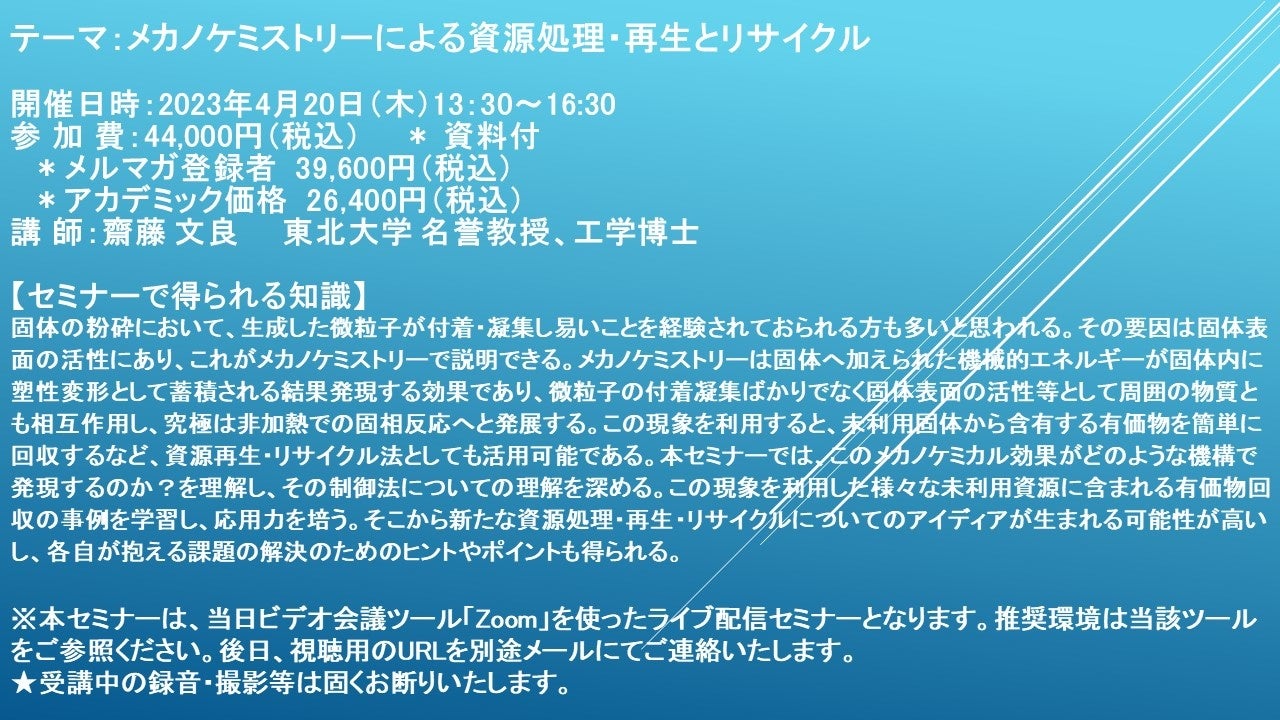 本セミナーでは、有価物を含む固体を粉砕し、活性化して、その後に化学的処理(水洗、酸あるいはアルカリ処理)して含有有価物を回収する事例や、粉砕後に物理的処理(加熱)して有価物を回収するプロセスを紹介します。ポイントは、粉砕処理での固体の活性化機構であり、メカノケミストリーとして知られる現象を理解する点であります。