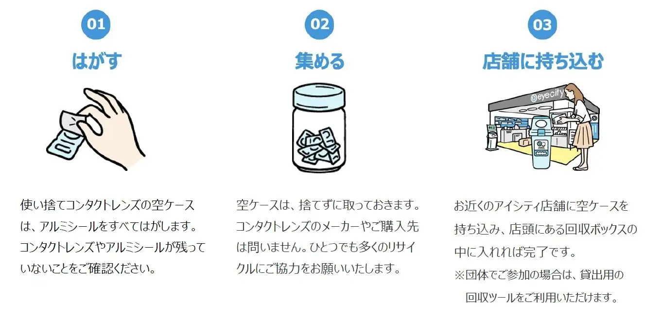 「アイシティ ecoプロジェクト」は、リサイクルが可能な使い捨てコンタクトレンズの空ケースを対象に、全国のアイシティ店舗に専用ボックスを設置して回収するリサイクル活動です。3つの社会貢献(1.空ケースの再資源化による環境保全、2.障がい者の自立・就労支援、3.日本アイバンク協会への寄付)へとつないでいくことを目的として、2010年より業界で初めてこの活動をスタートし、今年で活動期間は13年目を迎えました。