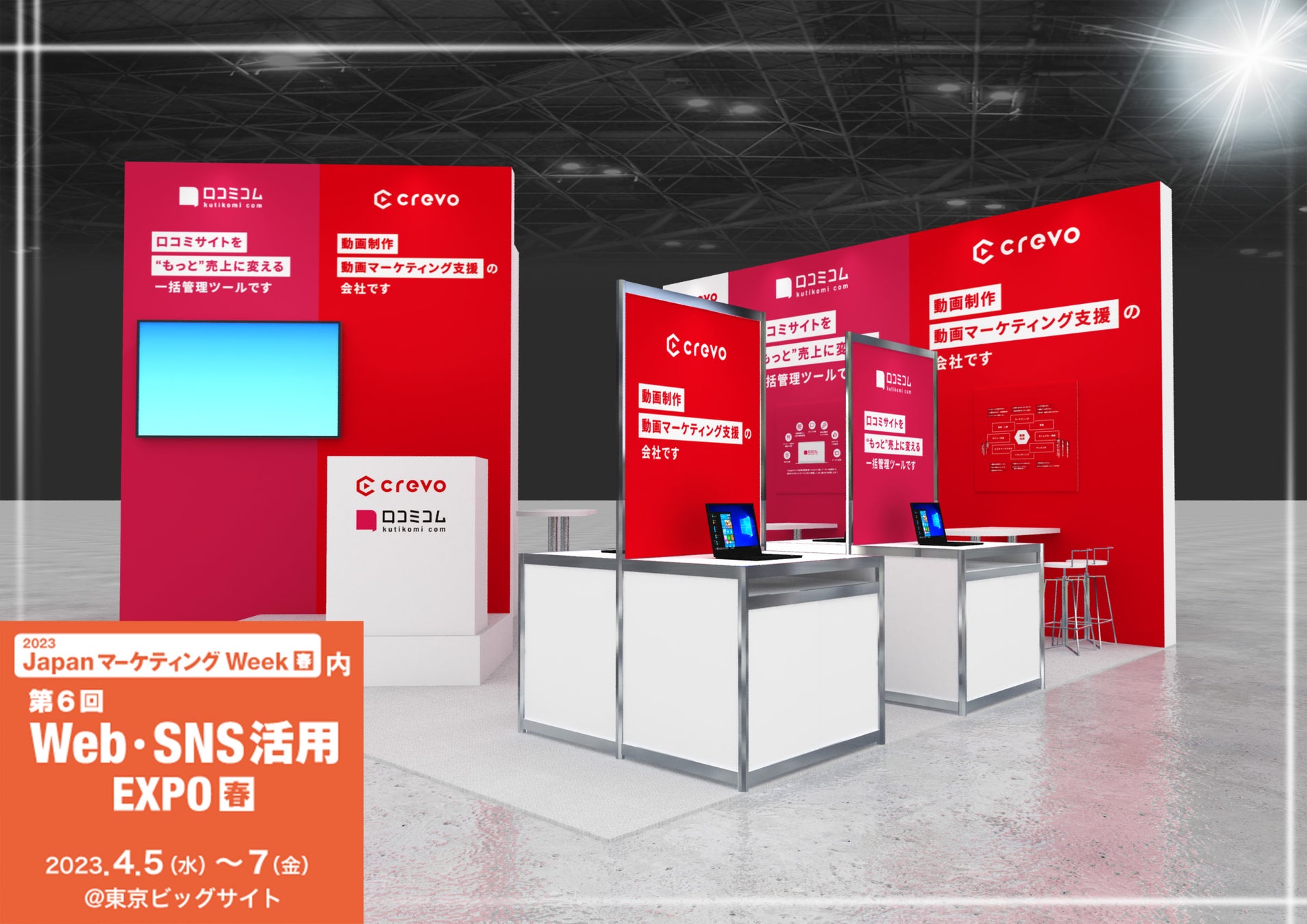 あらゆる経営課題を動画を軸に解決するCrevo(クレボ)株式会社(本社:東京都目黒区、代表取締役:柴田 憲佑、以下「Crevo」)と口コミサイトを”もっと”売上に変える、AI店舗支援SaaS「口コミコム」を運営する株式会社mov(本社:東京都渋谷区、代表取締役:渡邊 誠、以下「mov」)は、2023年4月5日(水)〜4月7日(金)に東京ビッグサイトで開催される2023 JapanマーケティングWeek【春】内「Web・SNS活用EXPO」に共同出展いたします。