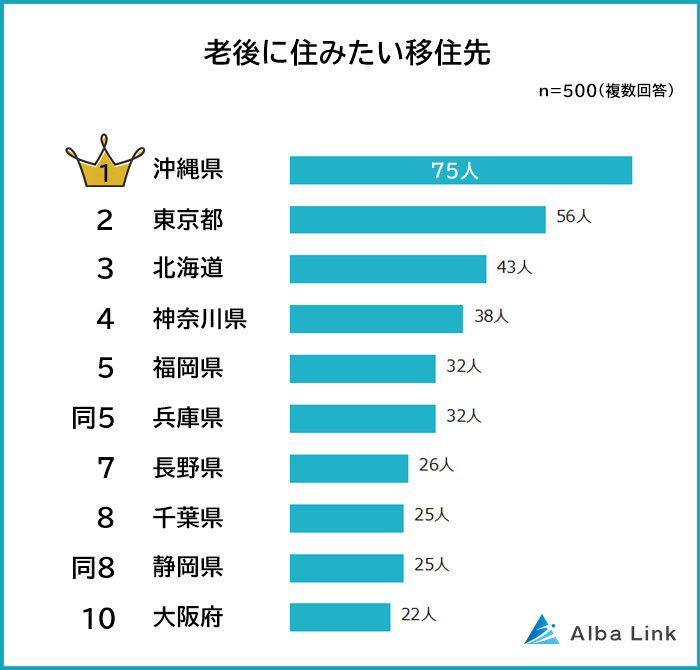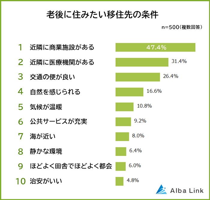 今回、株式会社AlbaLink( https://albalink.co.jp/ )が運営する訳あり物件買取プロ( https://wakearipro.com/ )は、全国の男女500人を対象に「老後に住みたい移住先」についてアンケート調査を実施しました。