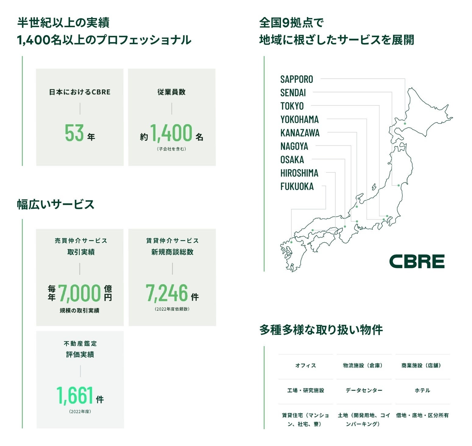 CBRE日本法人(シービーアールイー株式会社)は、不動産賃貸・売買仲介サービスにとどまらず、各種アドバイザリー機能やプロパティマネジメント、不動産鑑定評価などの17の幅広いサービスラインを全国規模で展開する法人向け不動産のトータル・ソリューション・プロバイダーです。CBREの前身となった生駒商事が1970年に設立されて以来、約半世紀以上にわたり、日本における不動産の専門家として、全国9拠点で地域に根ざしたサービスを展開してきました。企業にとって必要不可欠な「ビジネスインフラ」として認められる不動産アドバイザリー&サービス企業を目指して、国内約1,400名*のプロフェッショナル(*子会社を含む)が、最適かつ的確な不動産ソリューションを中立的な立場で提供いたします。詳細につきましては日本国内ホームページ www.cbre.co.jp をご覧ください。公式Twitterアカウント:@cbrejapan