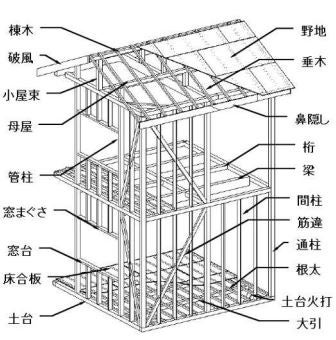 家の骨組みの部分のことです。具体的には、土台・柱・梁 (はり)・桁(けた)・母屋(もや)などのことをいいます。