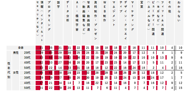 また、興味・関心がある内容は「情報(インターネットセキュリティなど)」が最も高く41%、次いで「プログラミング(35%)」「語学(31%)」「データ分析(31%)」が30%以上で続いた。性年代別でみると、「プログラミング」は男性30代、女性20代で50%以上と高い。また、「語学」は年代問わず女性で35%前後と高い。