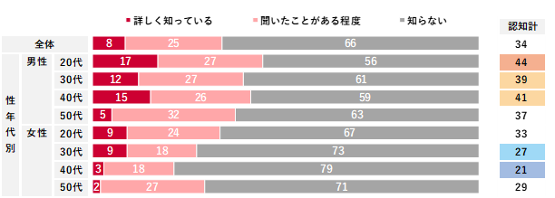 リスキリングの認知は、「詳しく知っている」が8%、「聞いたことがある程度」が25%となり、合わせると認知率は34%だった。性年代別でみると、男女ともに若年層の方が認知率が高い。