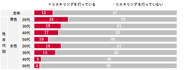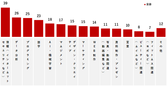 リスキリングの取り組み率は全体で13%だった。性年代別にみると、男女ともに若年層ほど取り組む割合が高く、特に男性20代は24%と高かった。具体的に取り組んでいる内容は「情報(インターネットセキュリティなど)」が39%で最も高く、「データ分析(26%)」「プログラミング(25%)」が続いており、ICT関連(Information and Communication Technology:情報通信技術)が多い傾向となった。