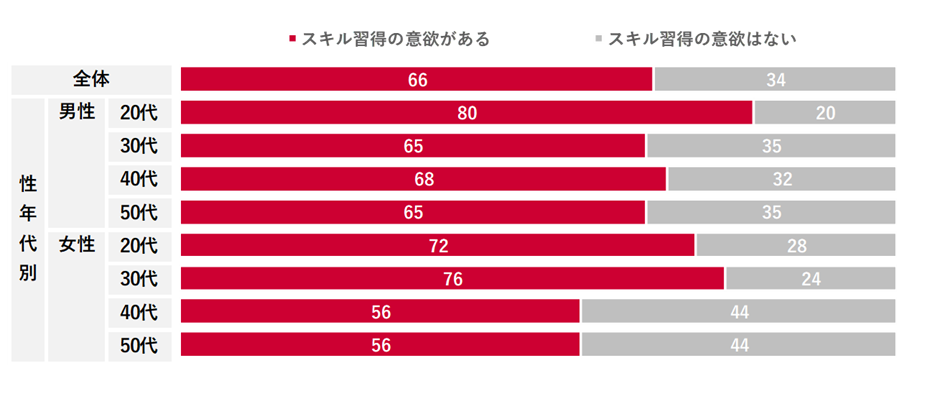 20歳~59歳で就労経験のある方にリスキリングに関する調査を実施した。まず、スキル習得に関する意欲を聴取したところ、66%がスキル習得への意欲があると回答した。性年代別にみると、男性は20代、女性は20代~30代が70%以上と高い結果となった。