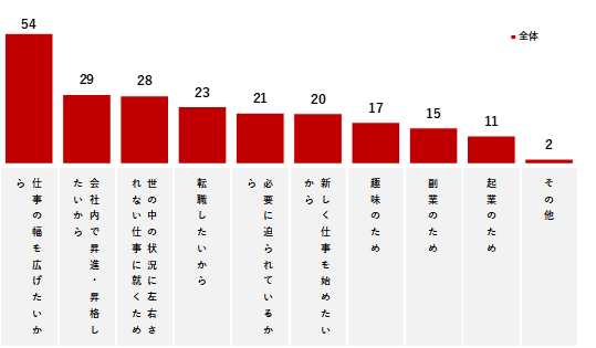 取り組んでいる理由としては「仕事の幅を広げたい」が54%と突出して高く、次いで「会社内で昇進・昇格したい(29%)」と、職種の転換よりも現状の業務範囲の拡張を志向する傾向がうかがえる。