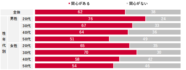 リスキリングへの興味・関心を調査(※)したところ、「関心がある」は62%と高い結果となった。性年代別でみると、男性は若年層ほど高く、最も高い20代で76%だった。女性も若年層の方が高い傾向があり、最も高いのは30代で70%だった。