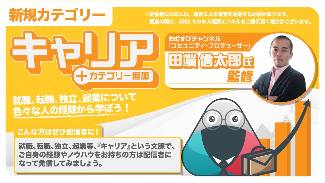 おむすびチャンネルには、海外で起業に挑戦されている方、海外ノマド生活をされる方、大手/中小企業で活躍される方、企業勤めから独立を果たした方、地方創生に取り組む方など、様々なキャリア/肩書き/職歴を持たれている方々が多く、『新たな働き方・生き方・キャリアの選び方』を見つけていく場としてクローズドなコミュニティである「おむすびチャンネル」の有用性・潜在性を感じるに至り、上記1〜4の配信カテゴリーに加えて、新たな配信カテゴリーとして、就職・転職・独立・起業について話すキャリア枠の導入を決定致しました。