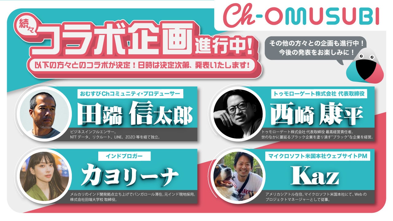 今後、おむすびチャンネルでは、田端信太郎氏の監修の下、キャリア(就職・転職・独立・起業)に関する様々な企画を行っていきます。直近では、ビジネス系インフルエンサー様とのおむすびチャンネル限定のコラボ配信が企画されています。