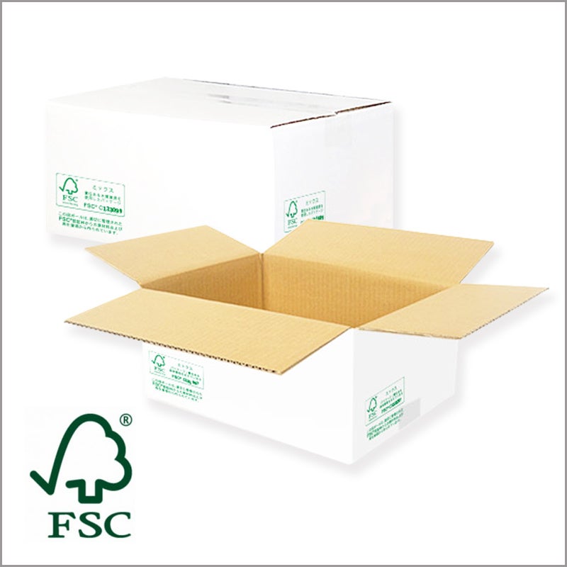 ダンボールは、そもそも環境にやさしい製品ですが、さらに優れているのがFSC認証マーク入りダンボールです。FSC認証製品は、製品に使われている原材料が、違法伐採に加担せず、責任をもって調達されたものであることを意味します。