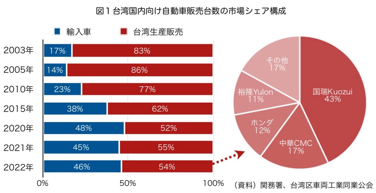 2022年、台湾国内向けの自動車販売台数は合計42万台であり、そのうち22.5万台が台湾で生産された車両で、残りの19.5万台は輸入車であった。台湾で生産販売する自動車メーカーの市場シェアに着目すると、TOYOTAを生産する国瑞汽車(Kuozui)が43%を占め、MITSUBISHIを生産する中華汽車(CMC)が17%、そしてHONDAを生産する台湾本田が12%のシェアを獲得している。また、輸入車の市場においては、欧米系高級車の他に、日系のTOYOTA、LEXUS、MAZDAが主要なシェアを占めている(図1)。