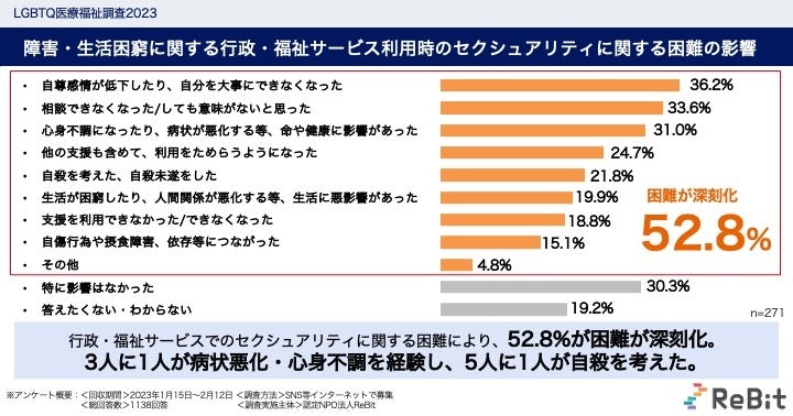 本調査から、LGBTQの8割が障害や生活困窮に関する行政・福祉サービスを利用した際にセクシュアリティに関連した困難を経験し、その影響で3人に1人が病状悪化、5人に1人が自殺念慮・未遂に繋がっていることが明らかになりました。また、医療サービスを利用した際にトランスジェンダー男性・女性の8割がセクシュアリティに関連した困難を経験し、その影響で4割が体調が悪くても病院に行けなくなり、4人に1人が自殺念慮・未遂に繋がる等、喫緊な状況が明らかになりました。